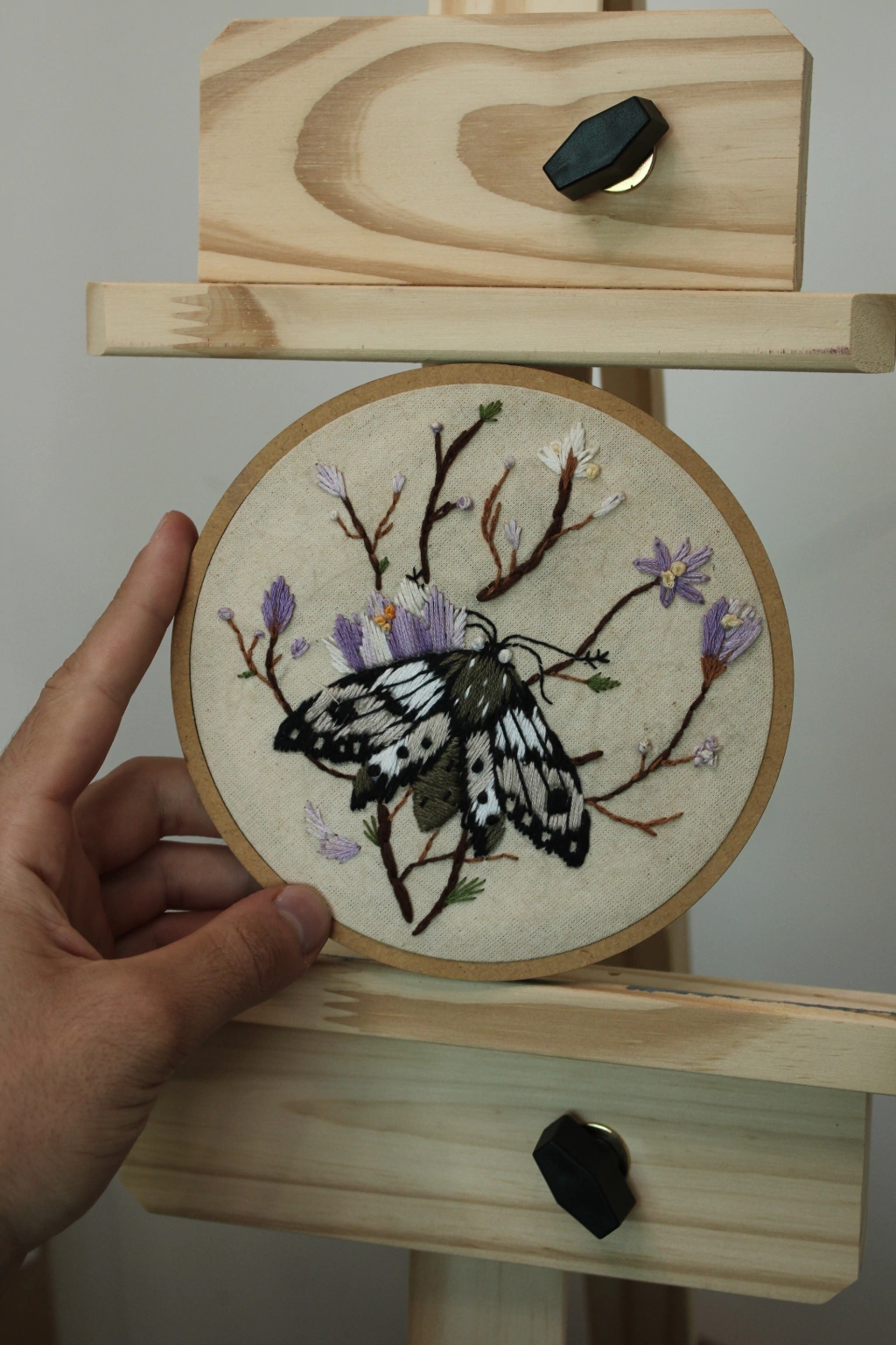 Descubra o Bordado A Mariposa das Magnólias, uma obra de arte única e exclusiva, feita à mão com linha Anchor. Com um diâmetro de 15 centímetros, este bordado em bastidor de MDF é perfeito para adicionar um toque de elegância à sua decoração.